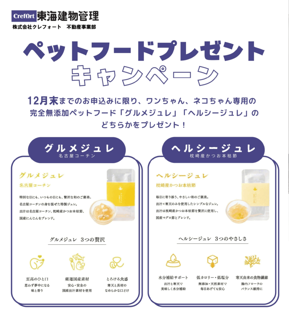東海建物管理が管理する「ペット飼育可物件」を12月末までにお申し込みいただいたお客様に、完全無添加ペットフード「ひのえ グルメジュレ」か「ひのえ ヘルシージュレ」をプレゼント!
